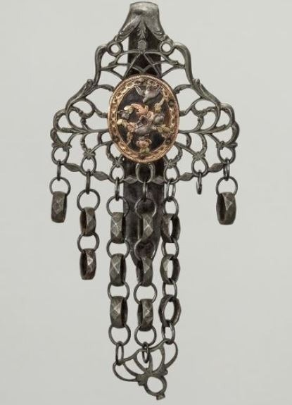 The small clamp was designed to hold up the hem or train of a long dress. In times when dresses often had long skirts that dragged on the ground, this tool helped keep the fabric from getting dirty while walking.